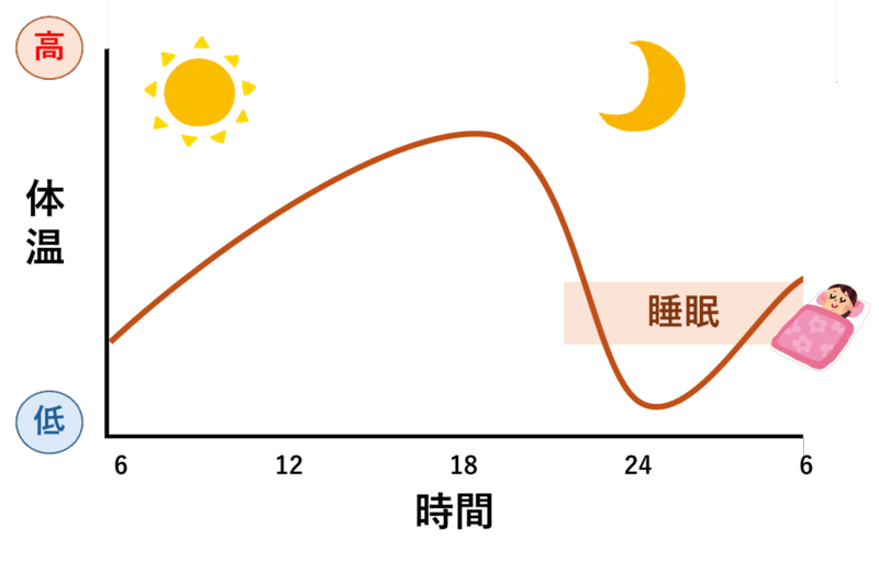 深部体温は1日の中で変化していて、朝や昼は高く、夜になると少しずつ下がります。この温度が下がることが、「そろそろ眠る準備をしよう」という身体からの合図になっているのです。